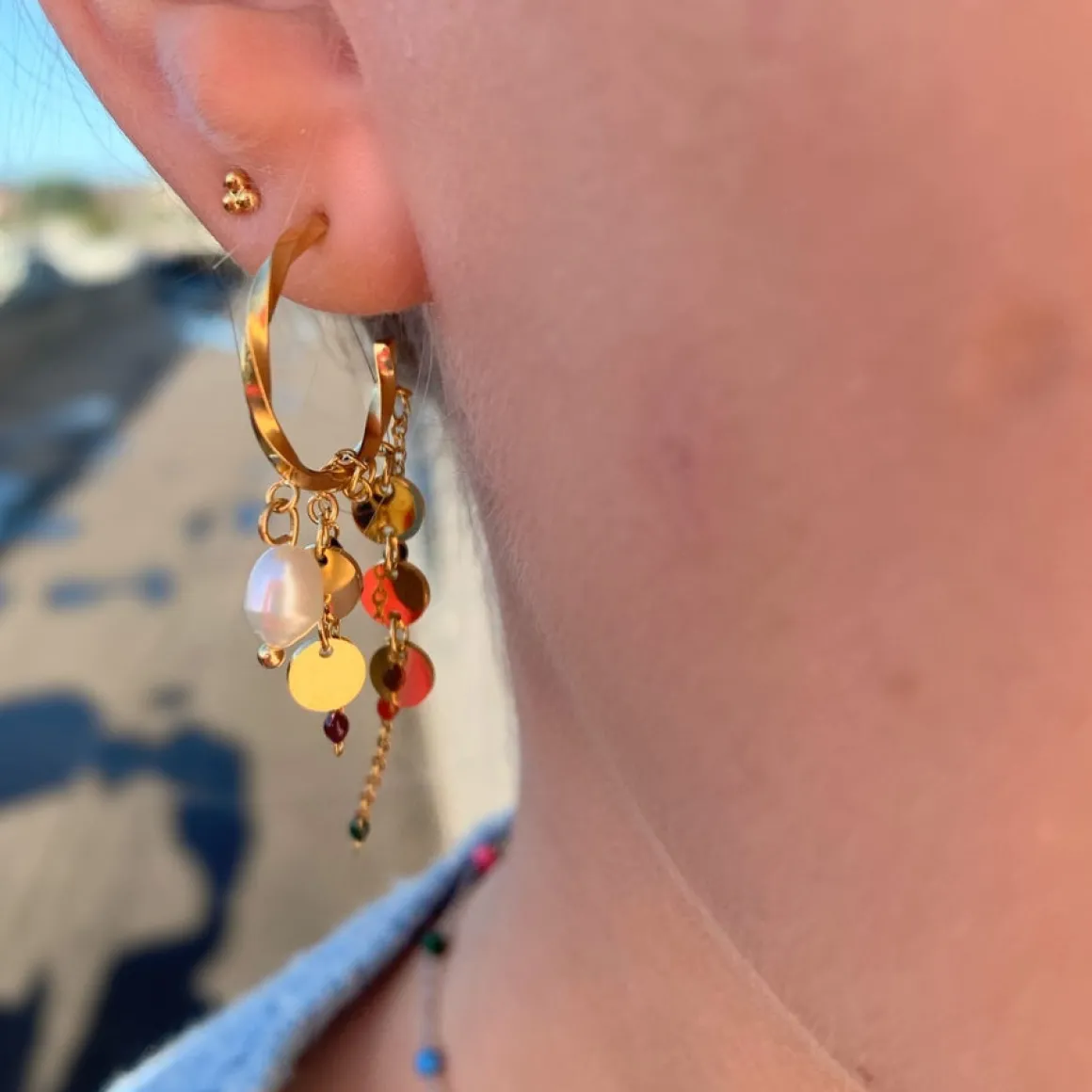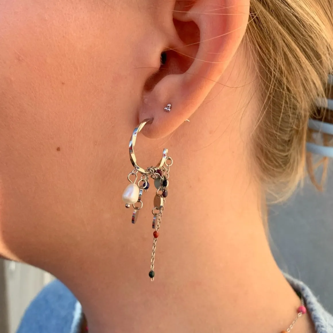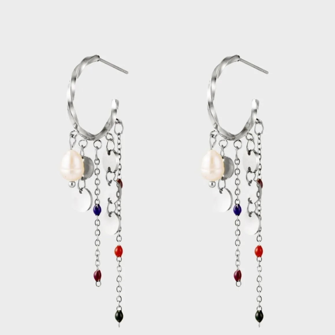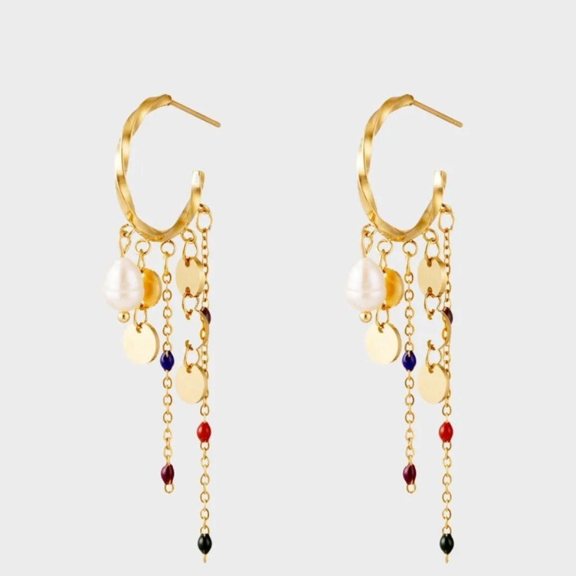Disse snoet hoops med vedhæng er et mix af forskelllige skønne vedhæng. Der er både kæde vedhæng, forskellig farvede perle vedhæng, cirkel vedhæng og perle vedhæng. Der er noget til enhver smag og det gør cirkel øreringene til noget helt unikt med de mange forskellige udtryk. De er alle forbundet på en twisted hoop, der gør det let at sætte ind i dine huller i ørerne. De farvede beaded vedhæng har en længde, der gør at de er perfekte alene. De giver meget personlighed alene i dette ene smykke. ‘Ava Rope Earrings’ kan både fåes til dig der elsker guld og sølv, da den kommer i guldfarvet og i sølvfarvet.