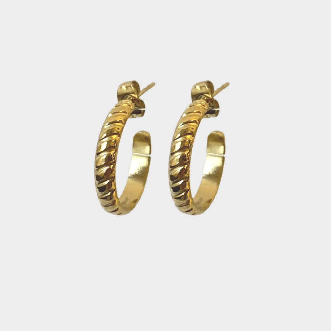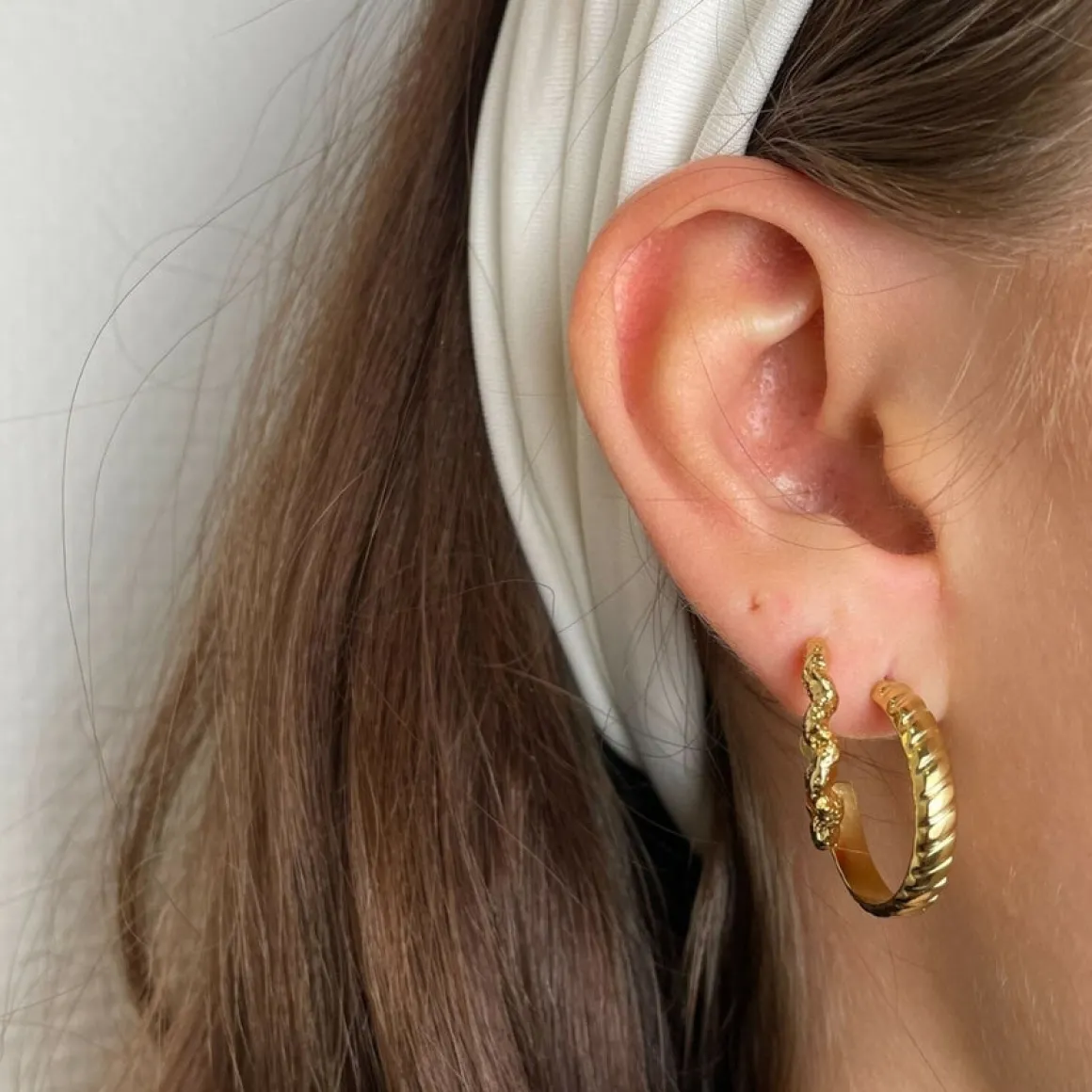Denne enkle hoop -ørering er udsmykket med et diskret snogemønster, der tilføjer et interessant twist til det ellers glatte design. Den kan nemt styles sammen med vores Moma Hoops og Camille Ring for et sammenhængende og stilfuldt look.