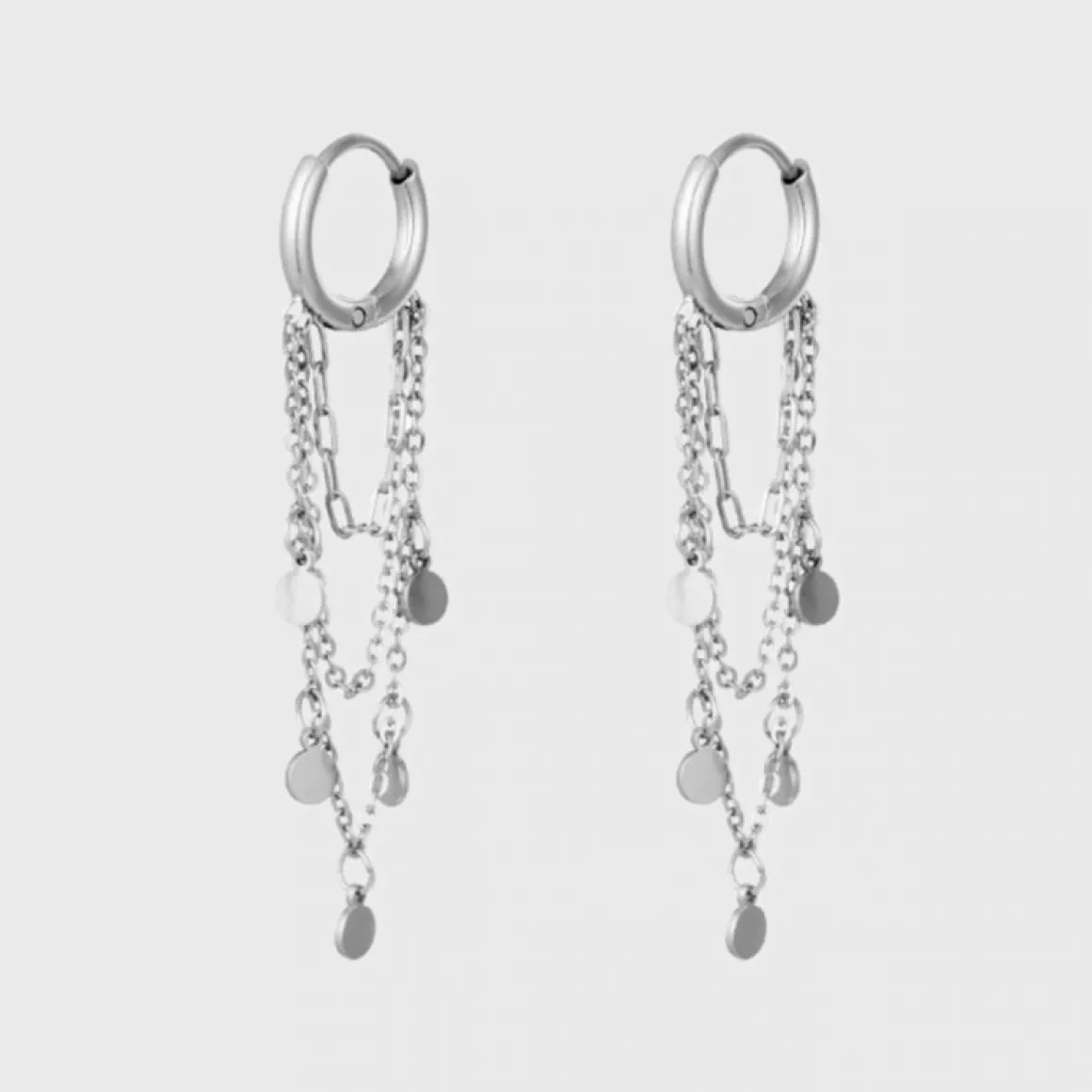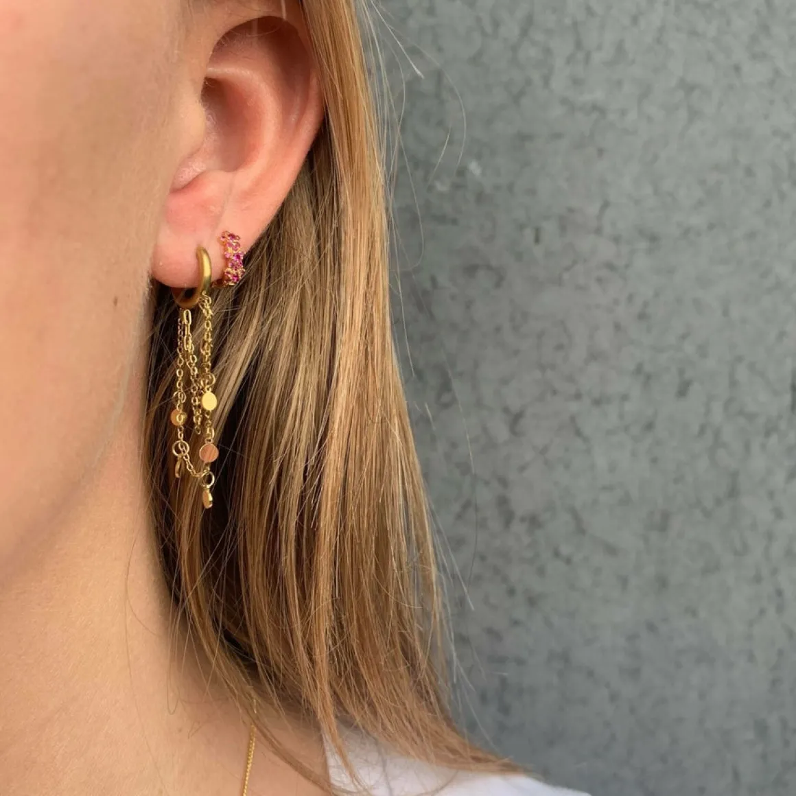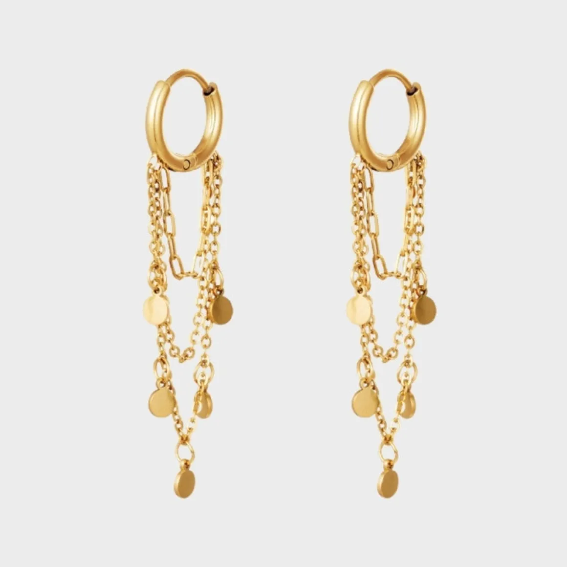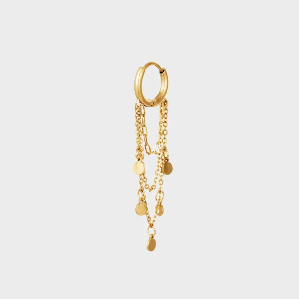 Disse hoops med kædevedhæng er et smykke der egner sig godt til fest. Der er en lille hoop som sættes i øret. Øreringen har mange små fine kæde vedhæng, der giver liv til smykket og pifter det hele op. Chain kæderne har små ovale dråbeformede vedhæng som igen går dem til noget ekstra og pifter smykket op og giver dem et fedt udtryk. Disse findes i guldfarvet.