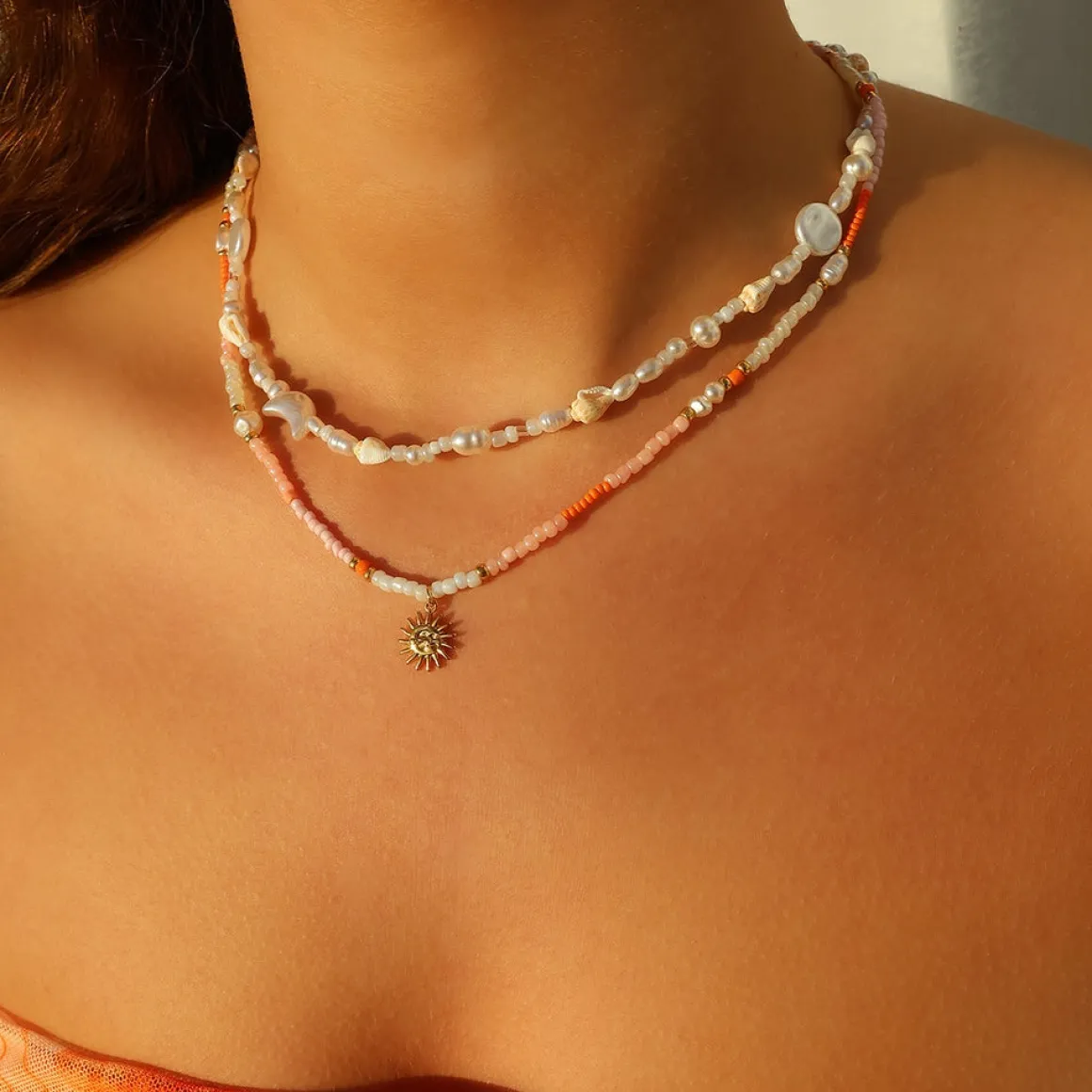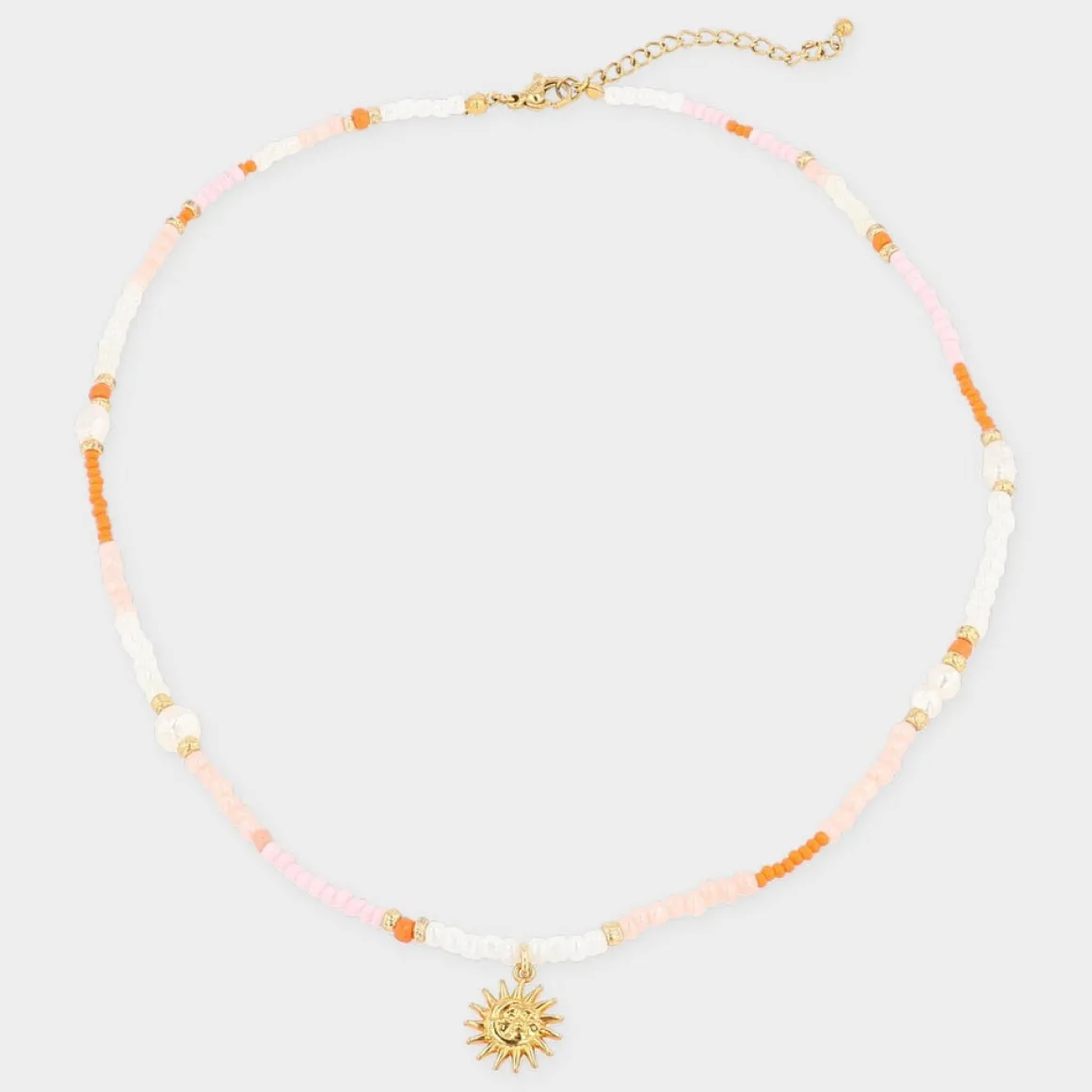 Vores Golden Hour Halskæden er inspireret af solnedgangen, med perler i varme farver og det elegante solvedhæng