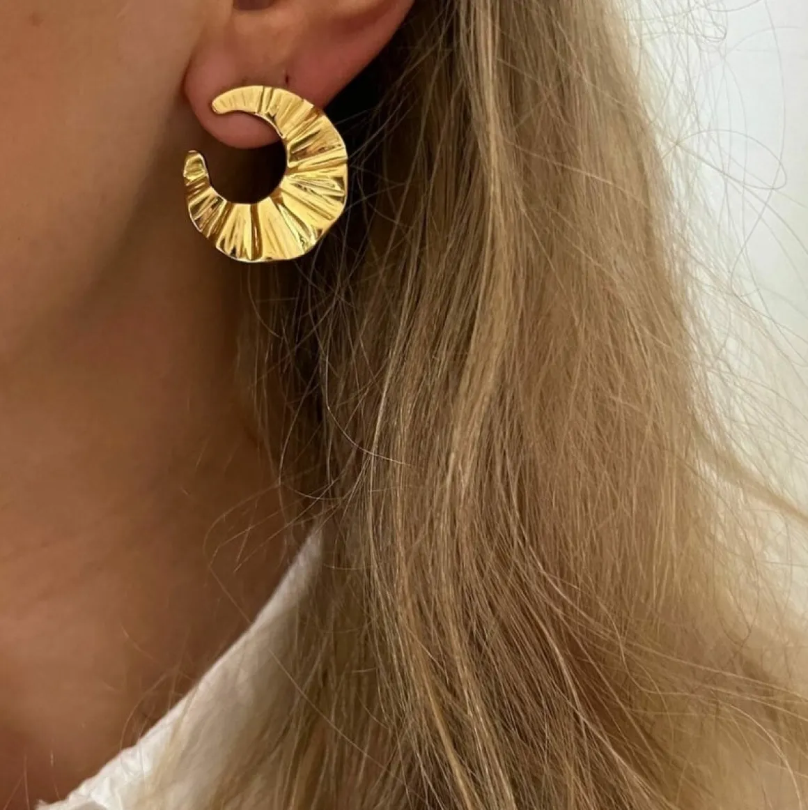 Hop med på bølgen af store øreringe og tilføj et strejf af elegance med Kimmie ørestikkerne. Disse raffinerede smykker skaber en dynamisk effekt ved smukt at sno sig bag om øret, hvilket ikke kun tilføjer en fin bevægelse, men også udstråler en sofistikeret stil.
