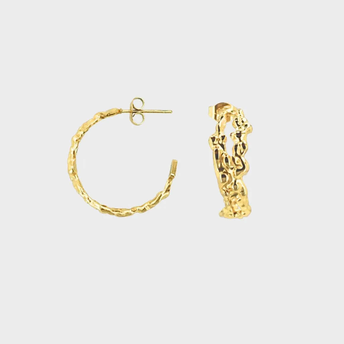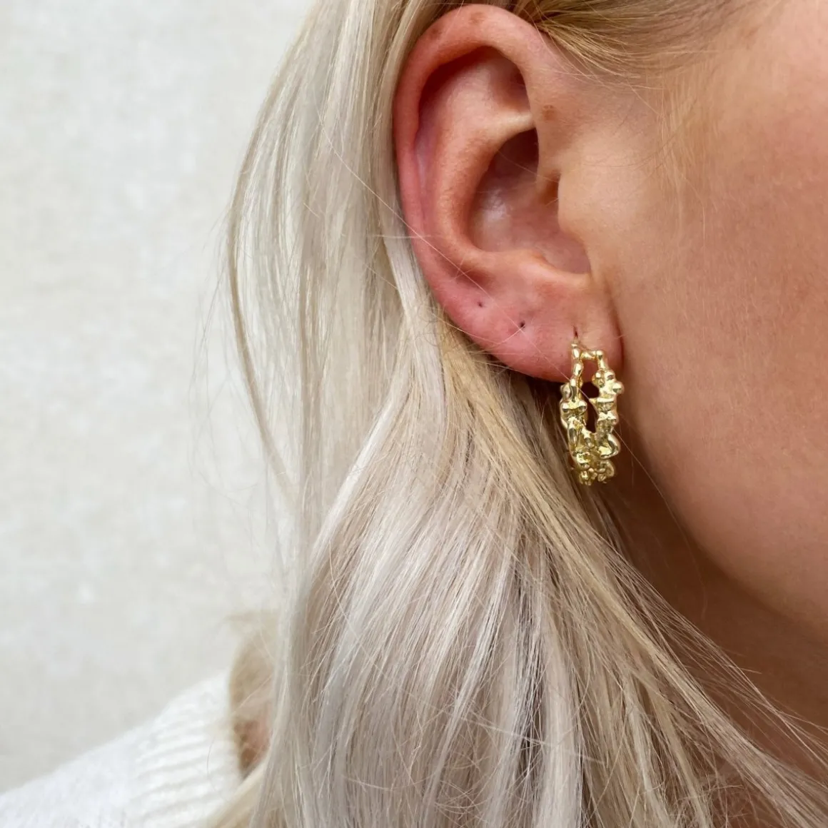 Rustikke øreringe med en teksturpræget overflade. Disse hoop øreringe i et rustik og råt look er perfekt til dig der ønsker at skabe blikfang med dine smykker! Tilføj disse chunky og rå øreringe hoops til et basic outfit for at skabe kant! Disse rå unikke øreringe findes i guldfarvet og med en matchende ring i både sølv – og guldfarvet! Lad øreringene tale for sig selv eller style dem med andre minimalistiske øreringe for at få det perfekte mix and match øreringe look.