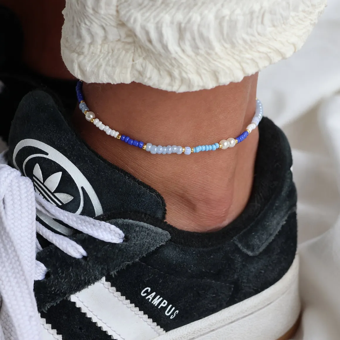 Hop på sommerens populære ankelkæde trend med vores Navi Pearl Ankelkæde inspireret af havet