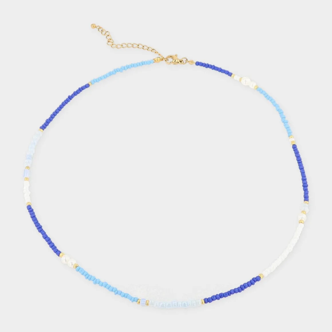 Perlehalskæde med blålige perler og ferskvandsperler, inspireret af havet med matchene armbånd og ankelkæde til